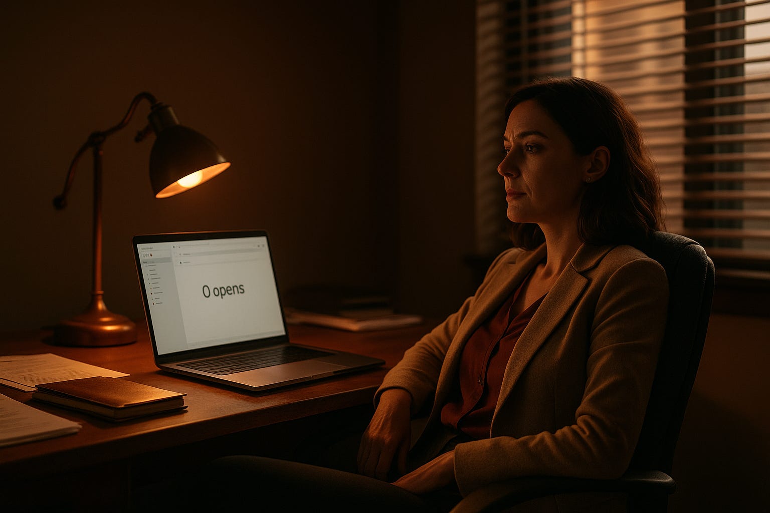 A real estate agent sits in a quiet office, gazing at a laptop screen that shows “0 opens,” symbolizing the challenge of unseen content and the importance of smart distribution.